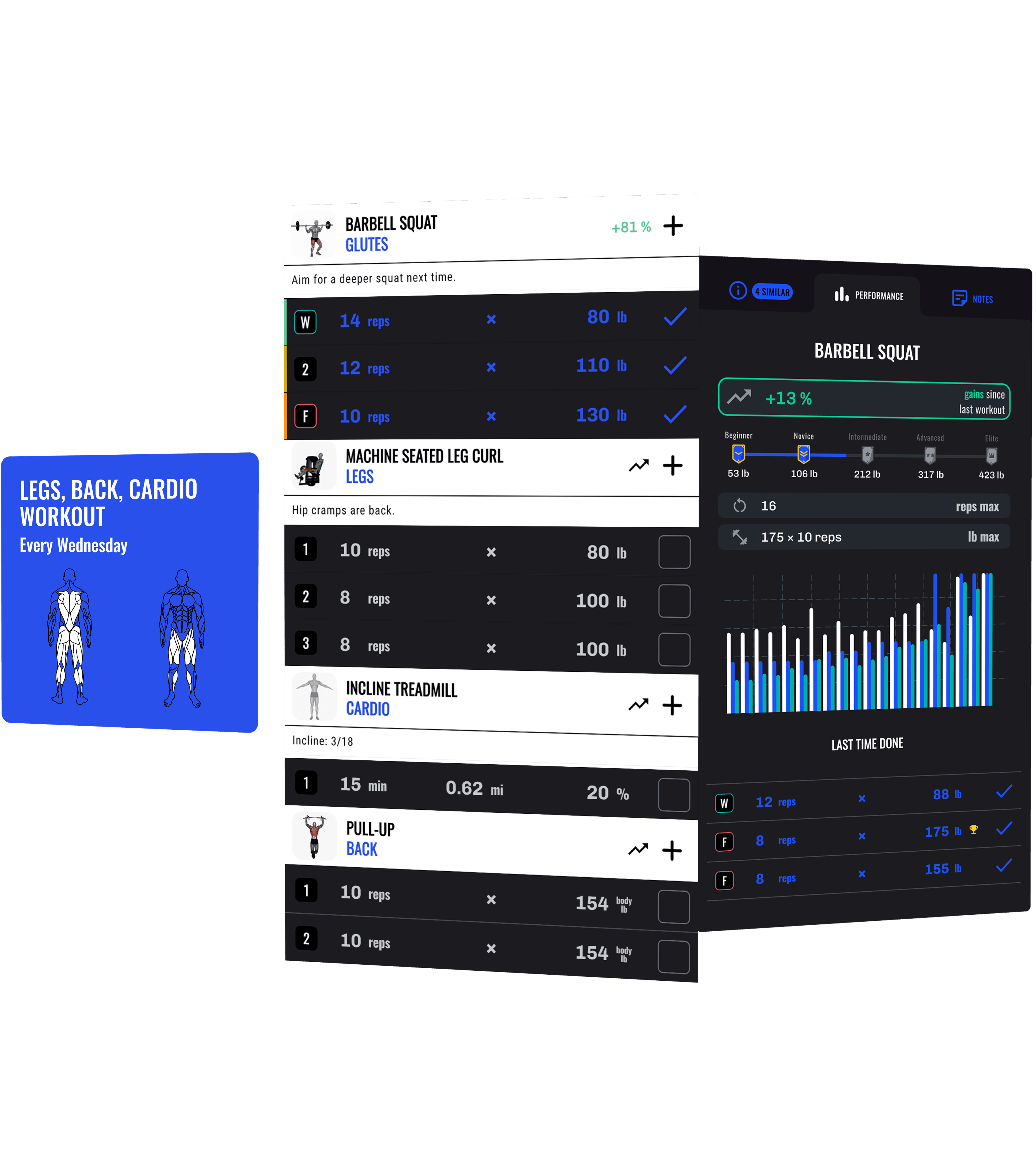 Legend keeps track of your previous reps and weight, and suggests what to do next.